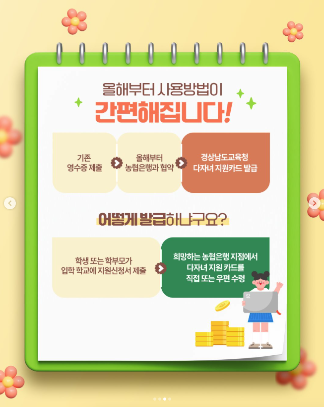 다자녀 지원카드를 통해 바우처가 지급되므로, 신청 후 학교에서 카드 발급 안내(가정통신문 또는 문자) 진행