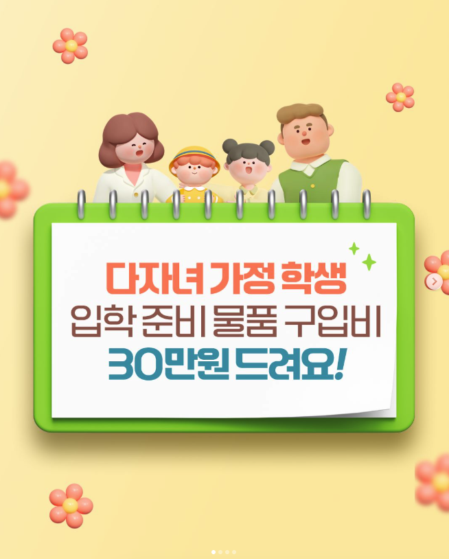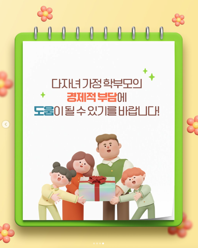 다자녀 가정을 위한 입학준비물품 구입비 지원은 학부모님들의 부담을 줄이고 학생들이 새 학기를 원활히 준비할 수 있도록 돕는 중요한 정책입니다. 신청 대상에 해당하는 가정이라면 반드시 신청 기간을 놓치지 말고, 카드 발급 및 바우처 사용 방법을 꼼꼼히 확인하세요!