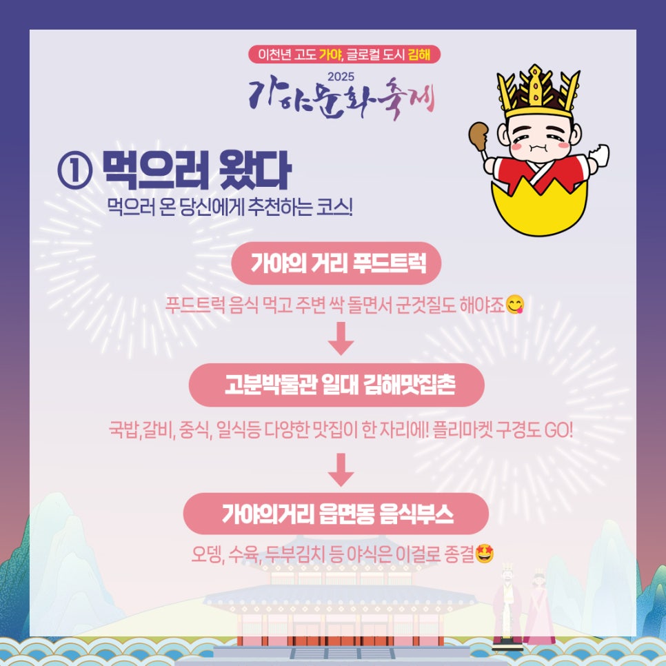 | 먹거리 | 가야의 거리 푸드트럭 → 김해맛집촌(고분박물관 일대) → 읍면동 음식부스 |